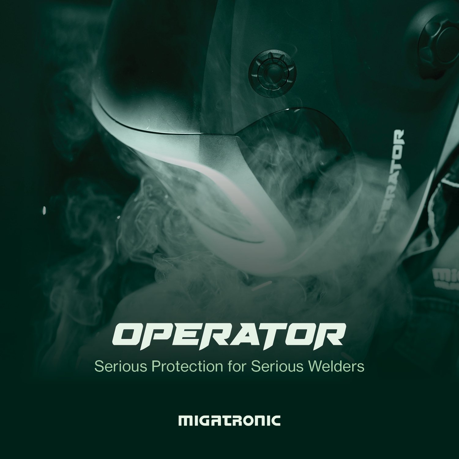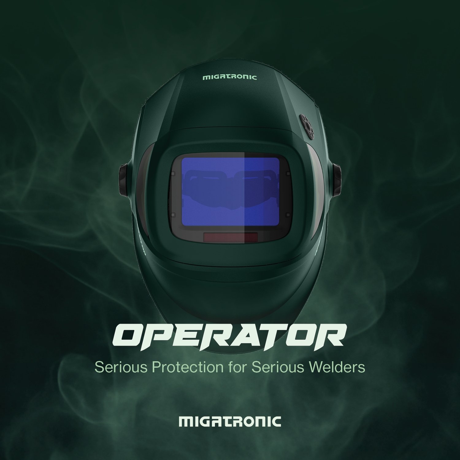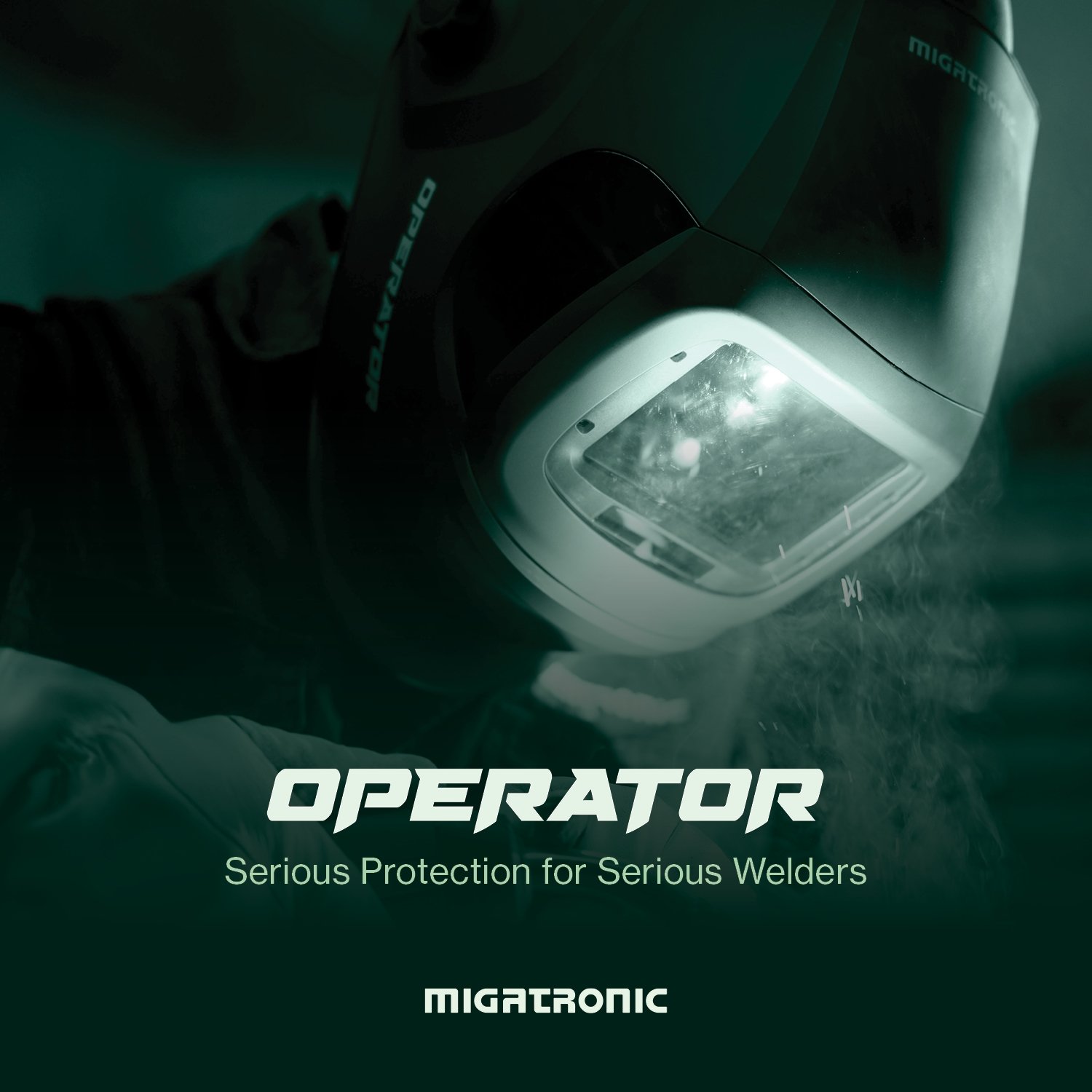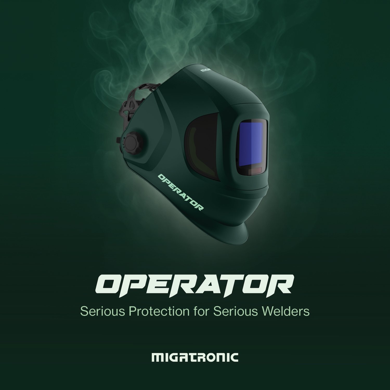 Casque de soudage haut de gamme Migatronic OPERATOR : cellule True Color, classe optique 1/1/1/1, vision 107×75 mm, bouton externe meulage, confort total et compatibilité multi-procédés.