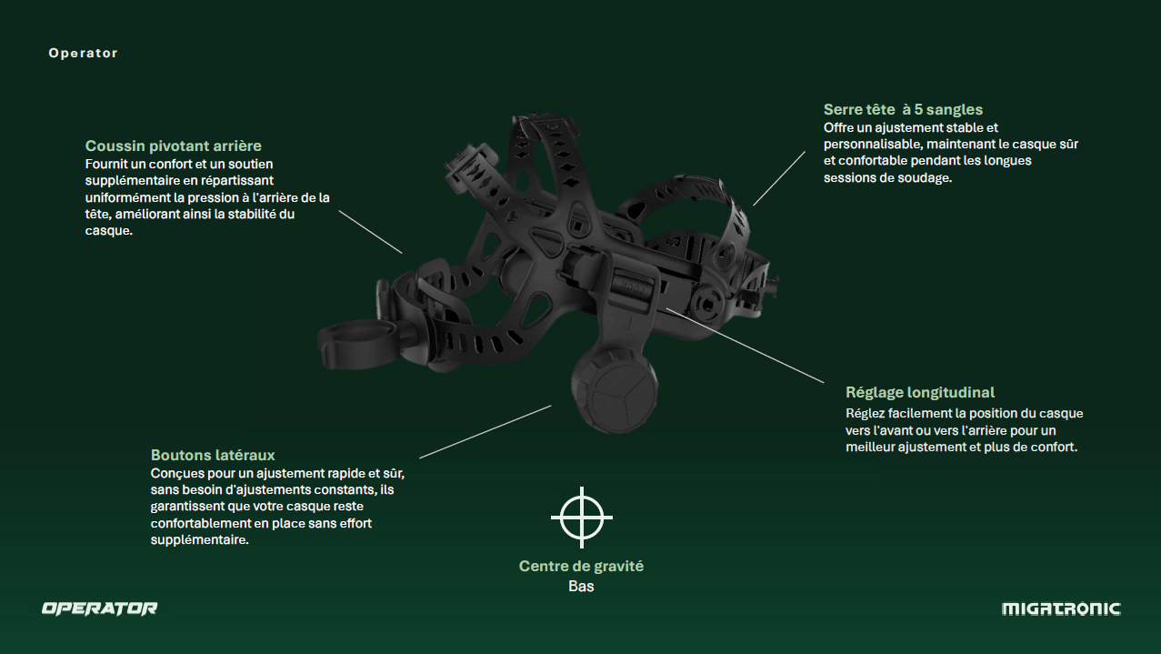 Serre-tête complet de rechange pour masque Migatronic Operator. Confort, maintien et ergonomie améliorée.